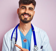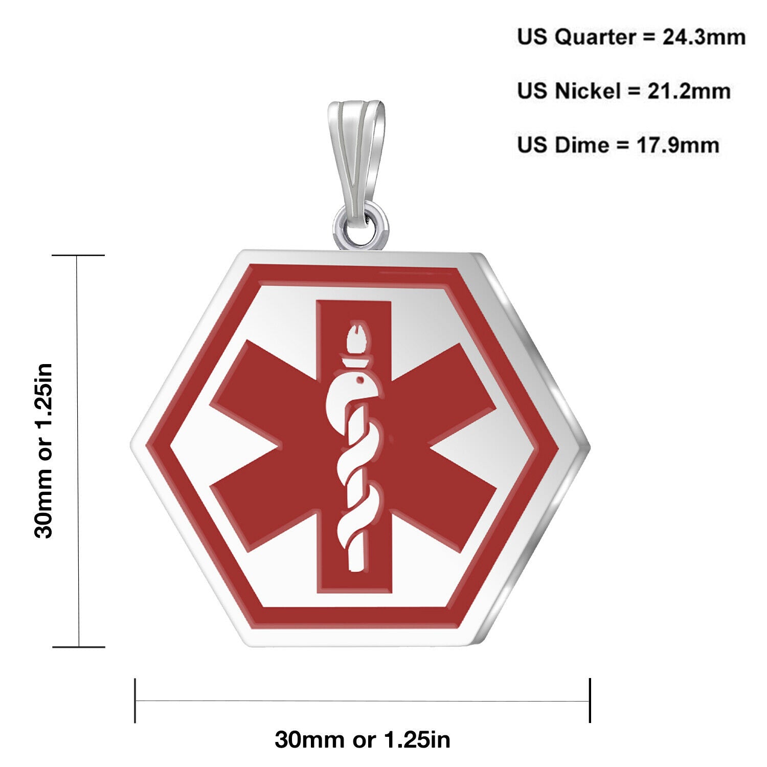 Sterling silver six sided medical pendant has bold red enamel and is engravable in the back. Easily recognized in an emergency. Made in US