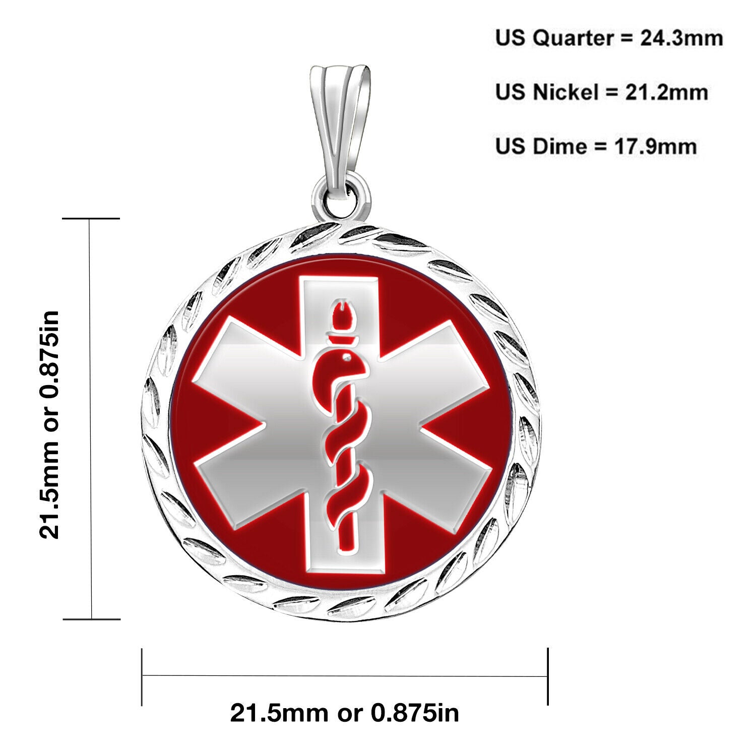 Sterling Silver Medical pendant features red enamel and diamond cut border. Engravable in the back. Made in the US. Easily recognized in an emergency.