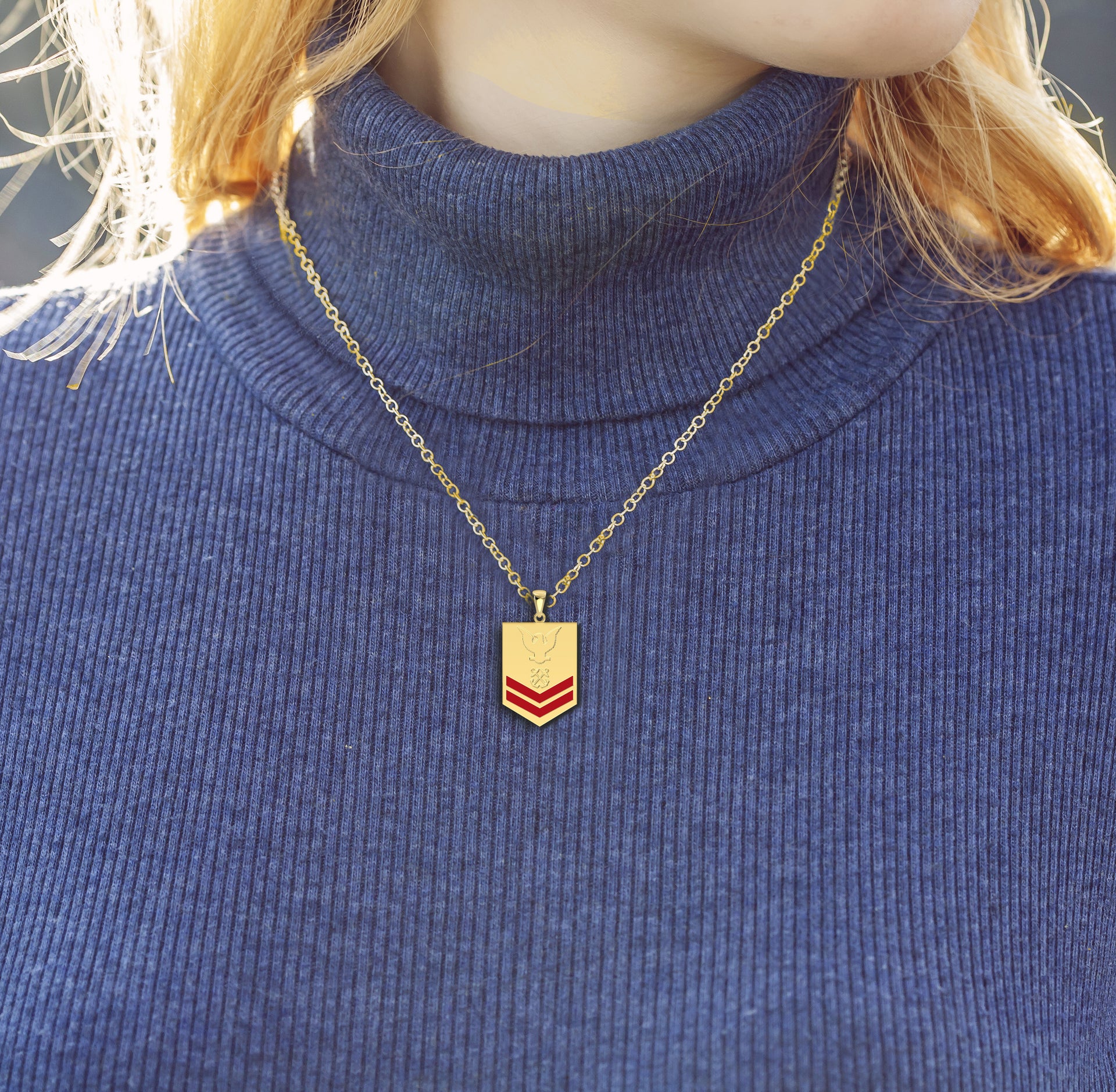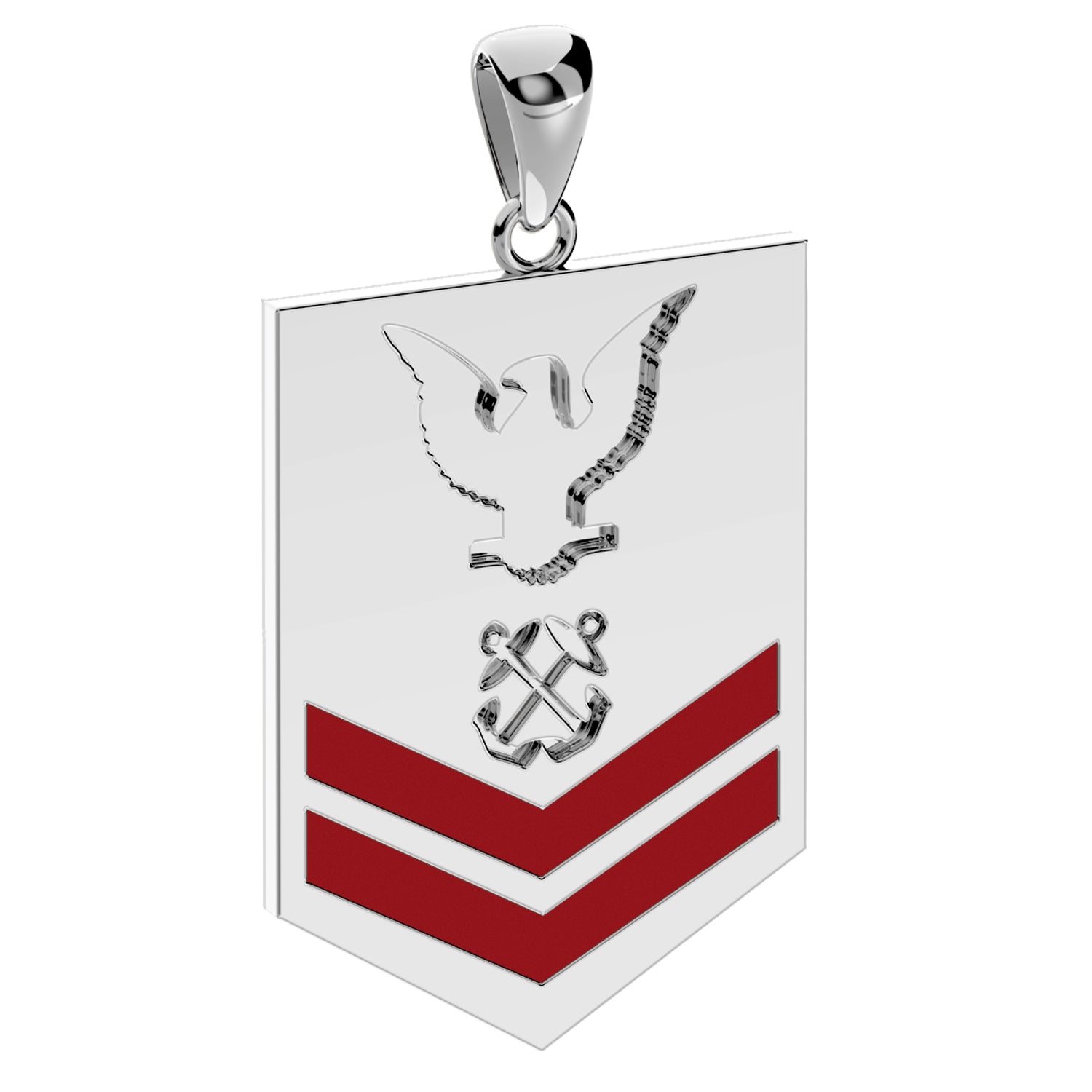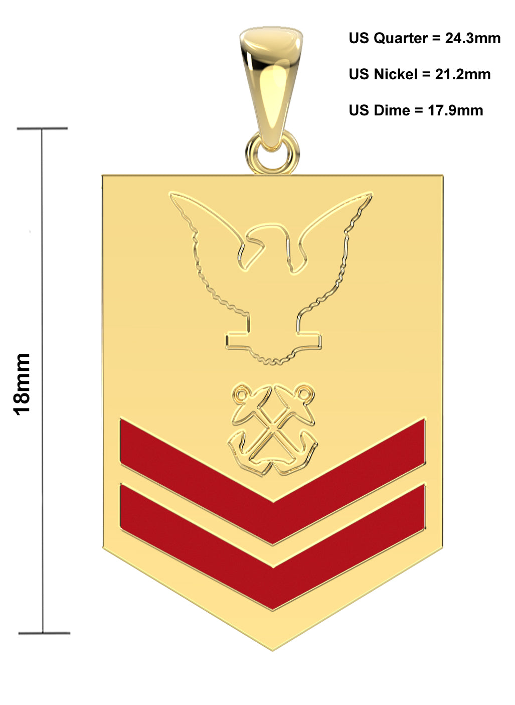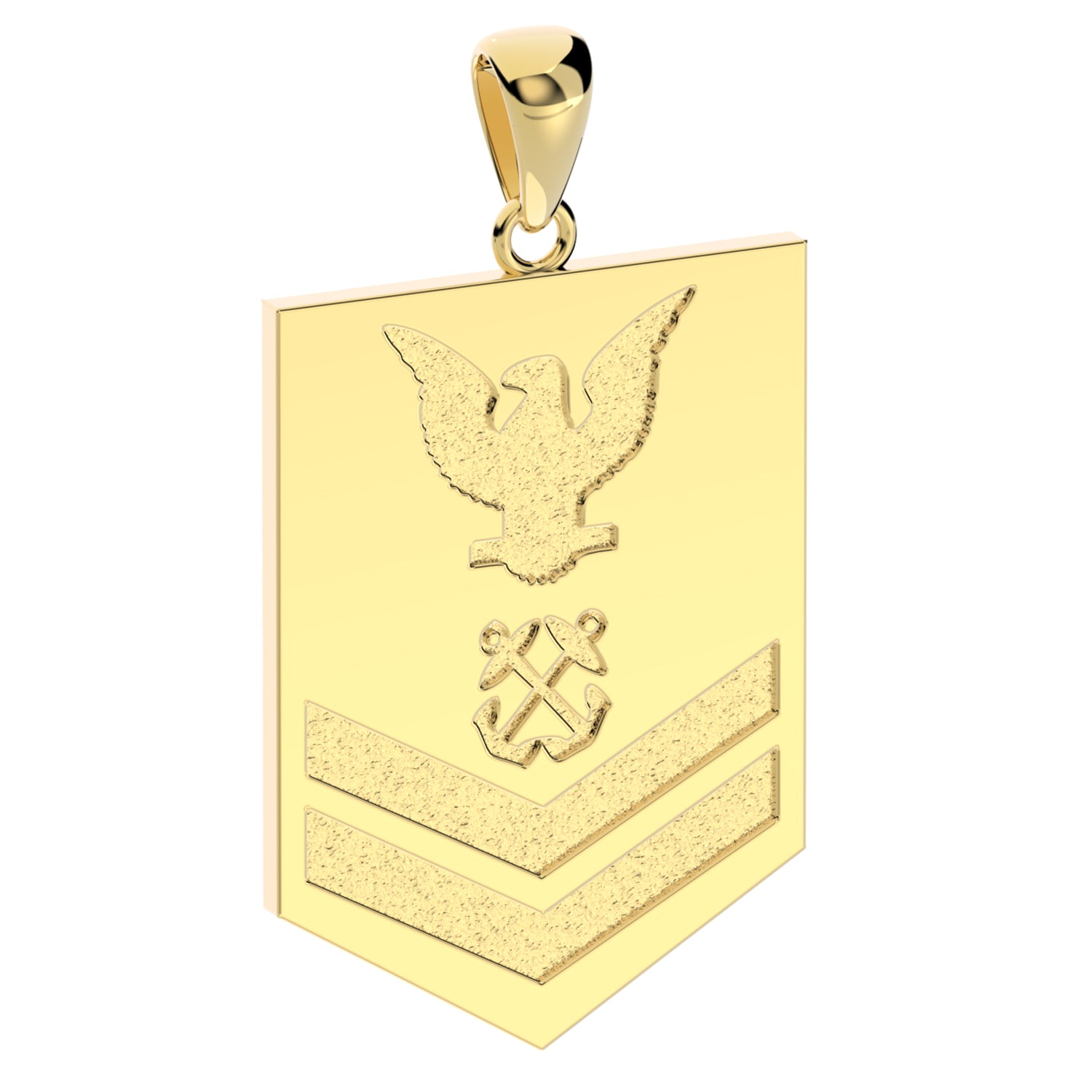 A brand new 14k or 10k yellow or white gold United States Navy petty officer second class rank pendant.